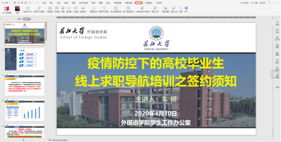 随着2020毕业季的临近,疫情期下学生面临的新问题和新挑战,4月10晚上,suncitygroup太阳集团就业指导老师车桥向毕业生们开展签约须知线上指导讲座。讲座通过长江雨课堂平台开展,学院2016级所有本科生参加。