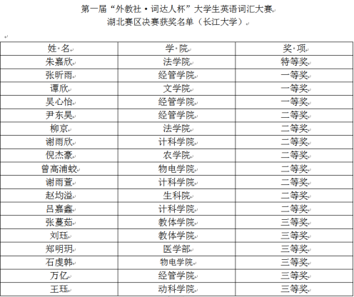 (通讯员:罗博)5月28日晚,第一届“外教社·词达人杯”大学生英语词汇大赛湖北省赛区决赛圆满落幕,我校共有20名非英语专业学生参加决赛,17名同学摘得奖项。法学院法学类31904班的朱嘉欣同学喜获本科组特等奖,3名同学获一等奖,8名同学获二等奖,5名同学获三等奖。我校获奖人数和质量居省属高校前列,suncitygroup太阳集团荣获“优秀组织奖”,suncitygroup太阳集团李琼华老师被评为“优秀指导老师”。