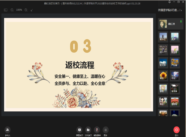 党委副书记魏红洁向大家详细讲解了《suncitygroup太阳集团2020届毕业生返校工作方案》。据统计,自6月15日至30日,我院共有318名毕业生获得批准返校。为热情、周到、安全、有序做好我院毕业生返校相关工作,学院成立了毕业生返校办理毕业手续工作领导小组,由院党委书记和院长担任组长;制定了详细的毕业生返校流程,每一名毕业生返校都安排有联系人,联系人均由学院教师和学生志愿者担任。魏红洁副书记号召全院教职工积极主动参与到毕业生返校工作中来,让学生高兴而来,满意而归。