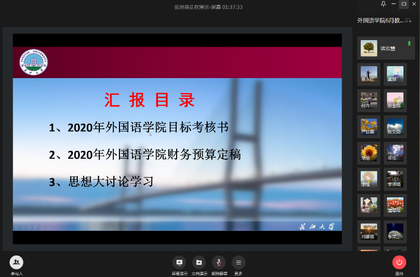 最后,院长谈宏慧向大家讲解了学院与学校签字的《2020年suncitygroup太阳集团目标考核书》主要考核指标情况;对学院2020年的财务预算进行了讲解和说明;对学校要求组织开展的“suncitygroup太阳集团办学思想大讨论”进行了安排部署,6月21日前以系(部、室)为单位组织开展讨论,6月23日学院组织集中研讨交流,各系(部、室)选派代表进行交流发言。她希望全院教职工积极参与到办学思想的讨论中来,主动为学院“十四五”规划的制定建言献策,促进学院健康稳定发展。