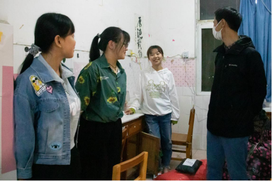 在视察完迎新点后,领导们和老师们出于对新生的关怀,又在下午走访了南苑新生宿舍,并在晚上走访了汉科学苑。为同学们送去了温暖和关怀。领导老师们首先来到的是南苑新生宿舍,今年外院新生中的男生都住在这里。在详细了解了宿舍情况之后,他们与新生亲切交流,告诉大家疫情期间要多通风,注意宿舍卫生问题,要相互了解,相互包容,构筑良好的寝室关系。此外,领导和老师们还表达了对外省同学的慰问,并且希望本地学生要热情好客一点,帮助室友更快适应新环境。