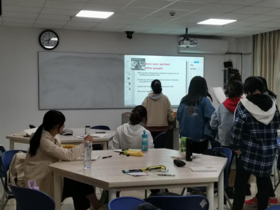 课堂上,大家都显得很积极主动,Bob老师先作了自我介绍,然后布置了本次课堂的第一个任务:请同学们找一个搭档进行互相的自我介绍。愉快的氛围中,学生们很快的便完成了该项任务。此时,Bob老师发布了下一个任务,向第三个同学介绍自己的搭档,介绍完之后,需要与自己的搭档一起来到屏幕前与外教连麦,进行一对二的对话。课堂任务布置完毕,本就活力四射的教室变得更加热闹了。学生们排成长长的一队,与外教欢快地交流。