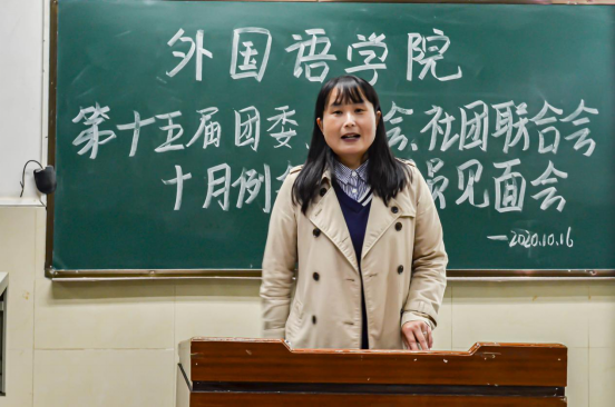 (文/张世瑾 范期明 摄/罗宁晞 李昕月 张芷艺)淅雨渐停,朗夜无风。10月16日晚七点,suncitygroup太阳集团第十五届团委、学生会、社团联合会十月例会暨新成员见面会在12教104教室举行。参加此次会议的有团委书记许泽琼老师、辅导员杜岳青老师、刘庸老师、方大鹏老师、陈颖老师,以及学生会各部门和社团联合会相关负责人。