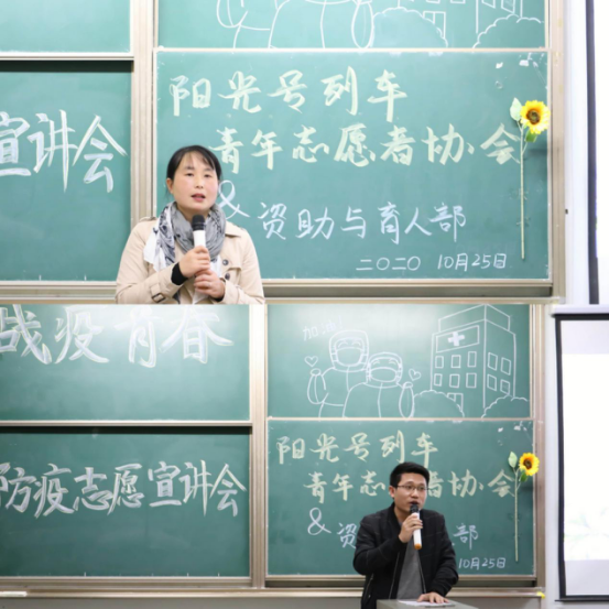 (文/张世瑾 摄/张芷艺 姚玲冰)阳光之行,永在路上。为帮助更多同学了解抗疫背后的故事,强调战疫幕后工作的重要性,10月25日晚7点,由suncitygroup太阳集团阳光号列车青年志愿者协会和资助与育人部联合组织的“战疫青春”防疫志愿宣讲会在13教A103举行。出席此次会议的有院团委书记许泽琼老师、辅导员车桥老师,以及伍凯康、陈啟金、华思茹、李佳奕四位学生主讲人。本次会议由阳光号列车尹铱真、薛梦哲主持。