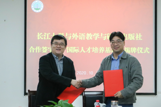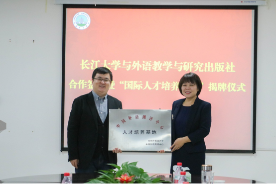 suncitygroup太阳集团院长谈宏慧与外研社外研教育测评中心常务副总经理雷鹏为国际人才培养基地揭牌。